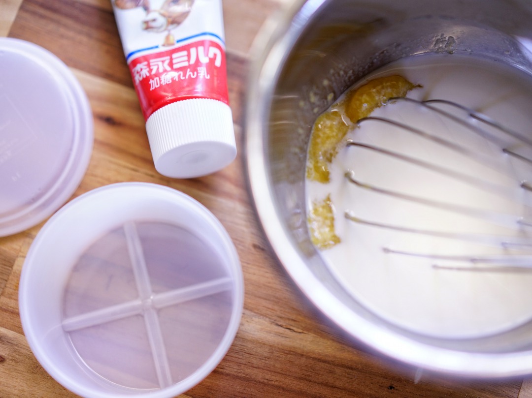 牛乳、コンデンスミルクをボウルに入れ、よく混ぜます。