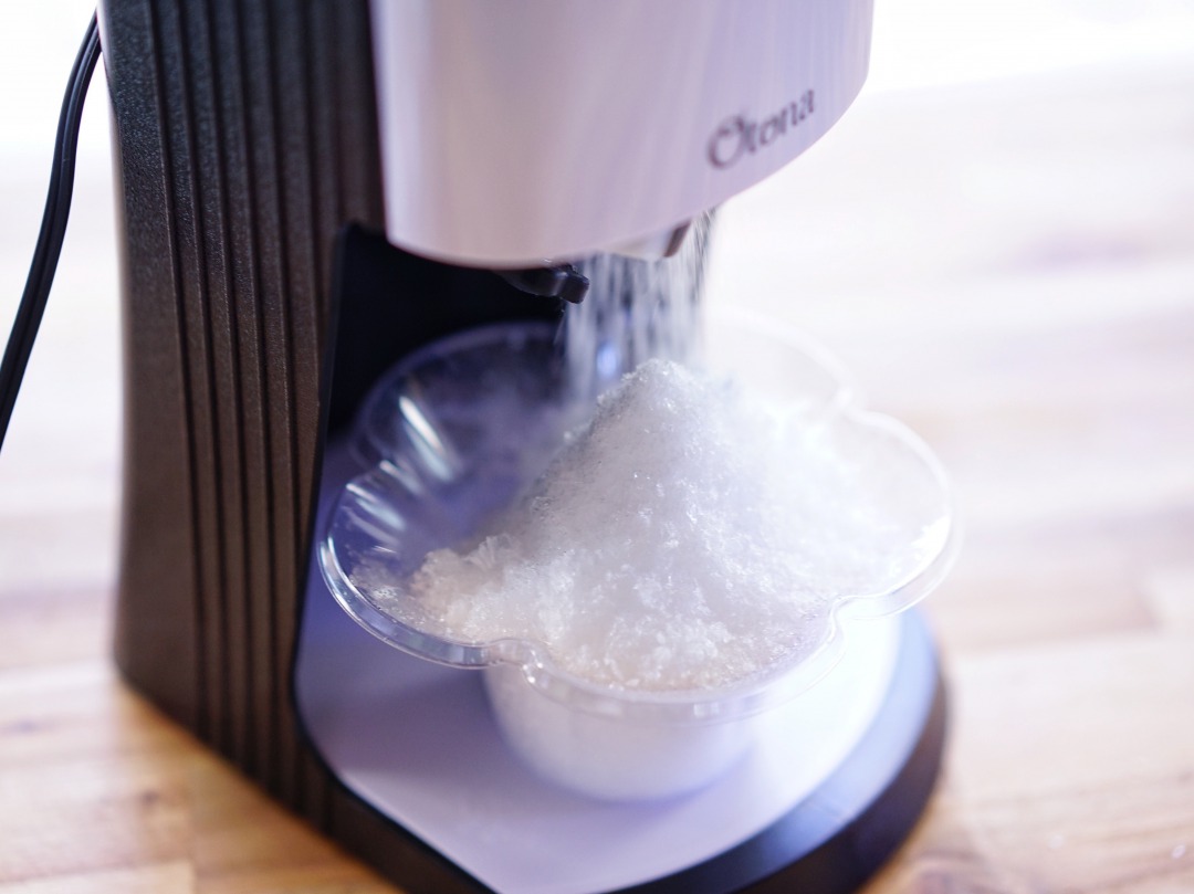 かき氷器にミルク氷をセットして、削ります。2つのカップに均等に削り終わったら、次にマンゴーミルク氷をセットして、さらに削ります。
