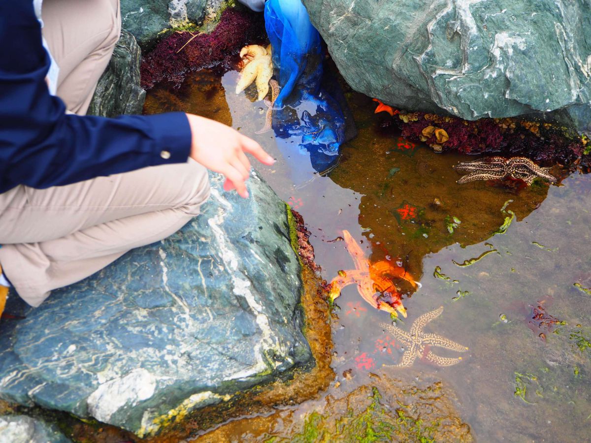 施設西側に広がる「蛇の目ビーチ」は広さ約4,500㎡と世界最大のタッチプールです。ヒトデやナマコが暮らす磯に裸足で入ることができるので、生きものたちにより近づいて触れることができます。この日もカラフルなヒトデたちに会うことができ、ひっくり返しておなかを観察したり、ツンツン指で触れてみたりと、まさに体験がいっぱい!