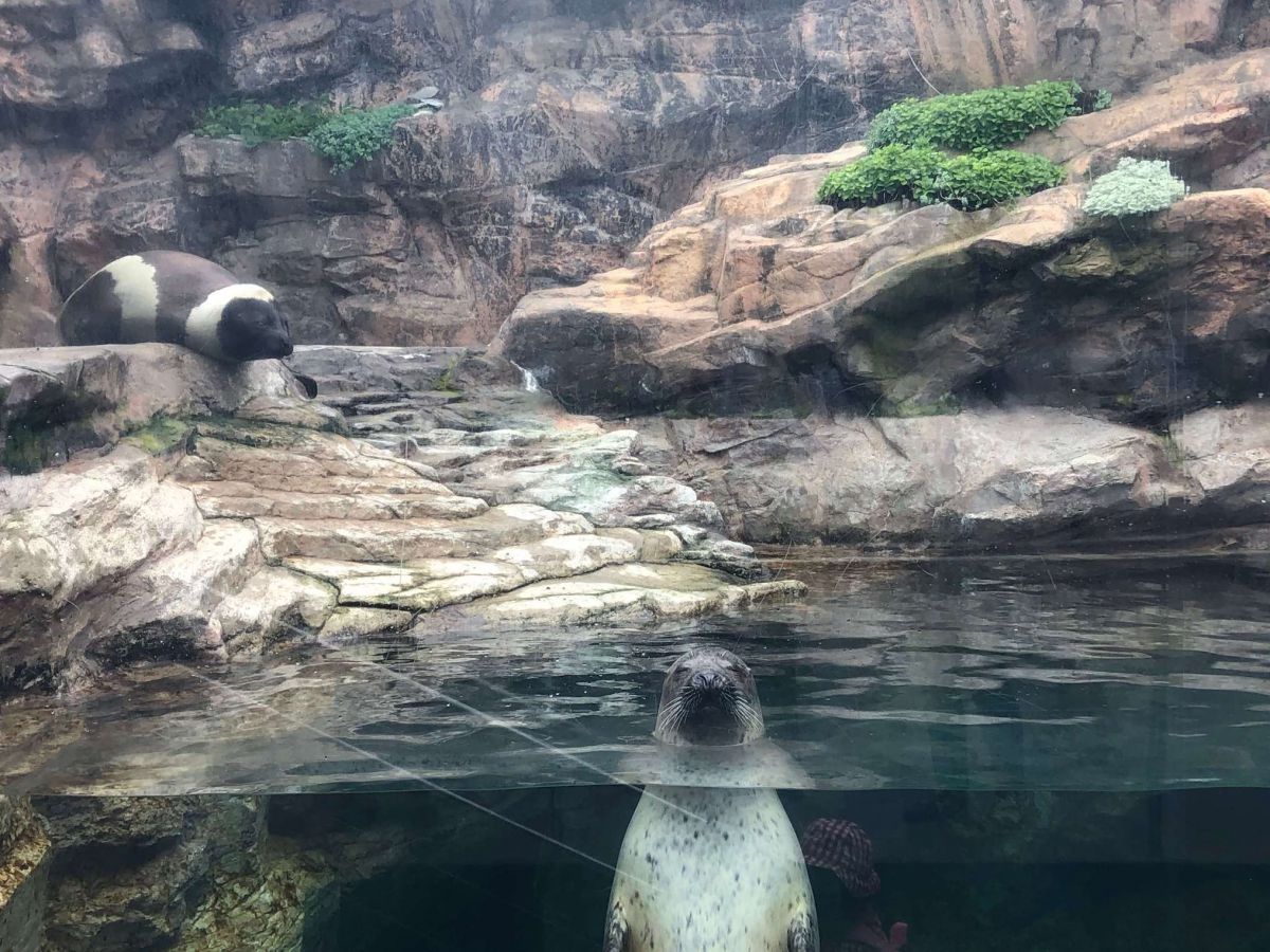 【クラカケアザラシ】オホーツク海やベーリング海など冷たい海に暮らしていて、ほとんど陸に近づかないため、生態が不明で飼育が難しい生きもの。展示されているのは世界でここだけです。じーっと一点を見つめる姿がなんとも愛らしい。