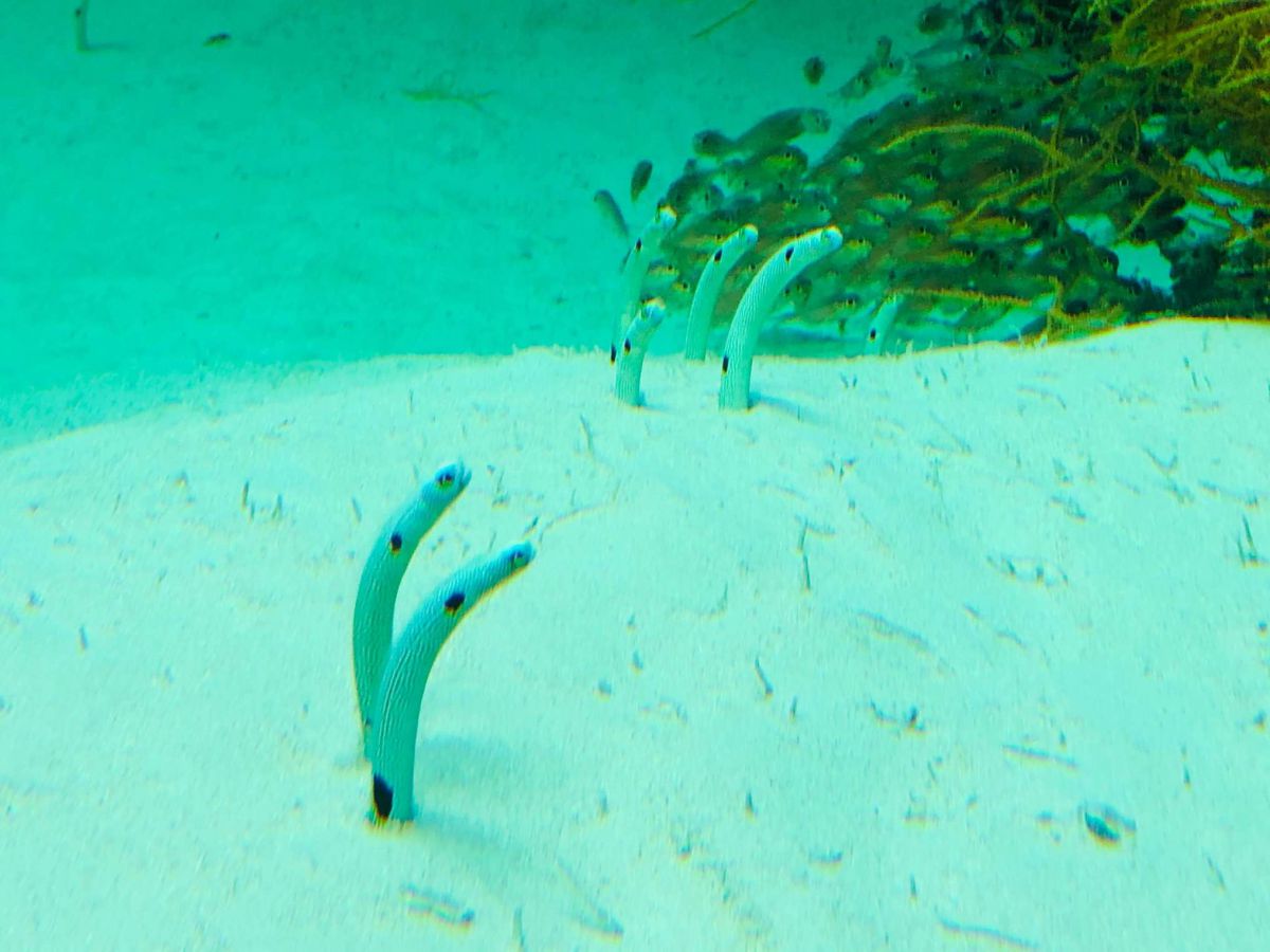 【チンアナゴ】土に埋もれている部分も含めるとどのくらいの長さか知っていますか?答えは大人で約30cmもあるそう!キョロキョロとあたりを見渡していますが、同じ穴から2匹が飛び出ている仲良しさんもいますよ。