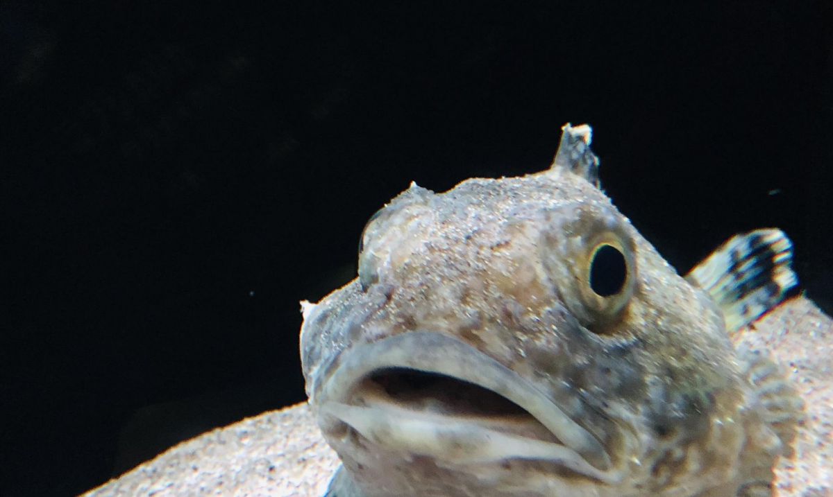 【コブシカジカ】北海道知床の500メートル以深で採集。大きなかわいい瞳に吸い込まれそうです。じっと見つめあっていたくなっちゃいますね。こちらの展示で面白いのが、「鍋や唐揚げで食べることもあるそうです」との説明板の一文。思わず笑みがこぼれます。