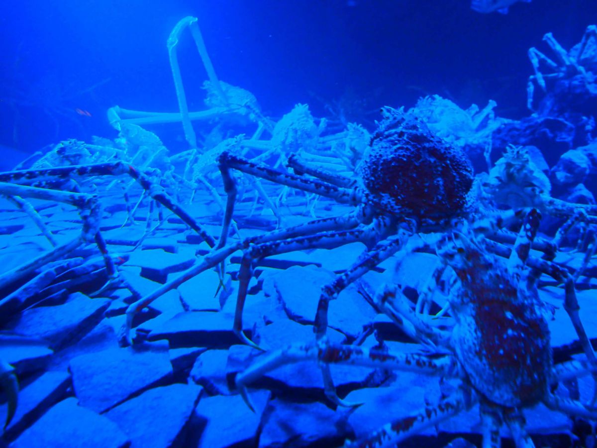 世界最大のカニ、タカアシガニです。オスはハサミ脚を広げるとなんと3メートルを超えるそう。こちらの水槽、青いライトで照らされて、SF映画を見ているような気持ちになる不思議な空間なので、ぜひ見て欲しいです!