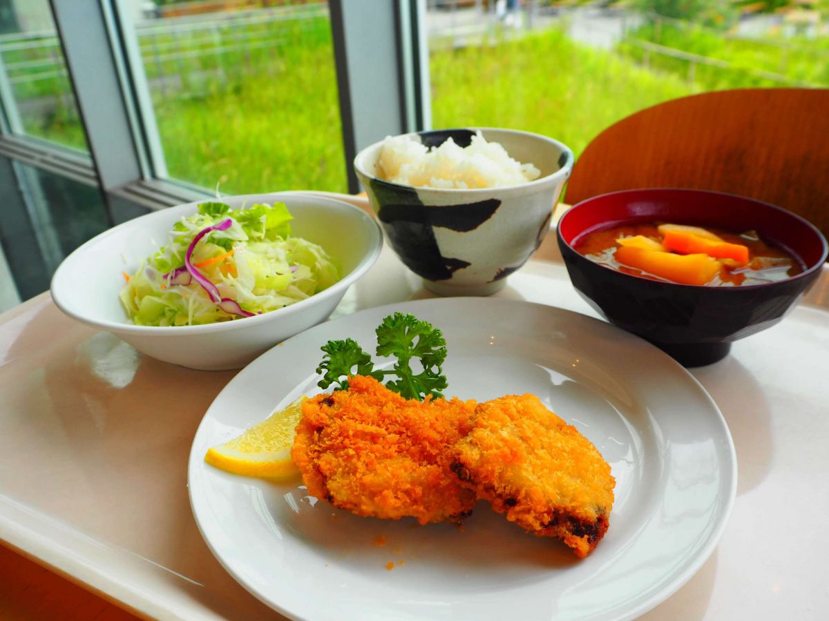 ランチは小名浜の海を一望し、自然光が差し込むレストラン「アクアクロス」でいただきましょう。今回チョイスしたのがコチラ「海の幸(くじらカツ)セット」(1000円)です。かつてくじら漁が盛んな場所だった小名浜にちなんだメニューで、低カロリーでヘルシーなくじらのサクサクなカツは、あっさりとしていて食べやすかったです。福島県会津地方の郷土料理であるくじら汁も一緒にいただけます。