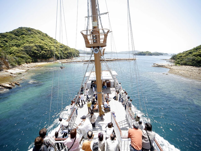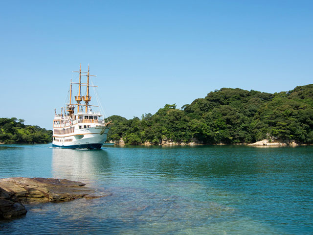 遊覧船で優雅なひととき!九十九島を縫うように走る真っ白な船体が印象的