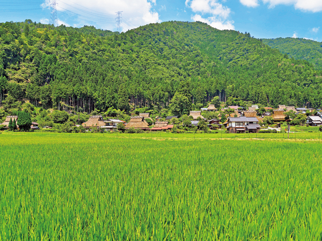 緑深い山々を背に立つ茅葺き屋根の民家。「美山かやぶきの里」は、日本の原風景が広がる美山の人気観光スポットです。39棟もの茅葺き屋根の民家が立ち並ぶ様子はどこか幻想的。ここで過ごす時間はのどかで、おばあちゃんの家に帰ってきたようななつかしさを感じることができます。カフェや資料館、民宿としても利用されているので、立ち寄って内部を見学することもできますよ。