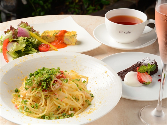 「air cafe」は、緑に囲まれたオープンテラスのあるカフェ。アーチ型のエントランスをくぐれば小さなガーデンが広がり、都会の喧噪を忘れることができます。ディナータイムには、カクテルやシャンパンをお供に、アラカルトやパスタをいただきながらゆったり過ごすのがおすすめ。控えめの照明と頭上に広がる星空がロマンチックな夜を演出してくれます。