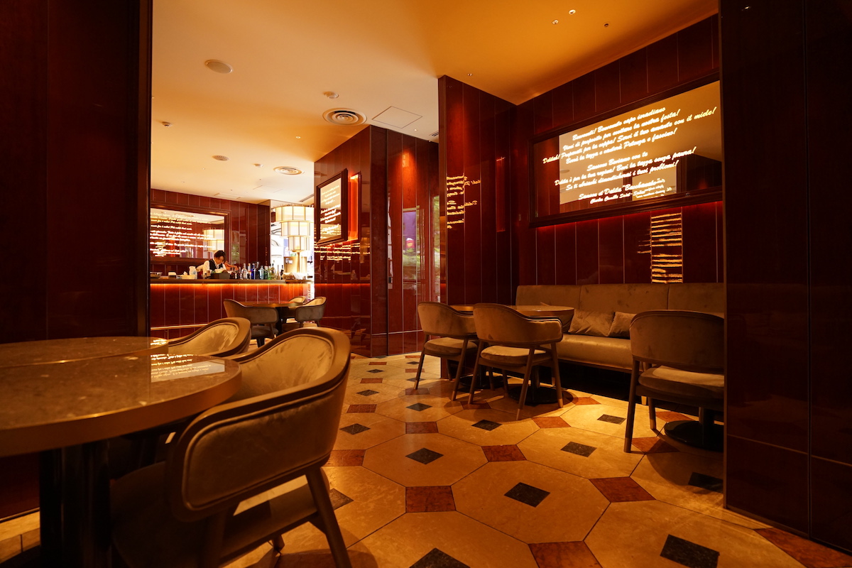 その魅力は、なんといっても大丸神戸店の美しいプロムナードに設けられたテラス席。リニューアルオープンに伴いテーブルと椅子が一新されました。道路側を向いて並ぶ席、その向こう側に建ち並ぶ高級ブランド店をながめていると、イタリアのバールにいるような気分になります。
