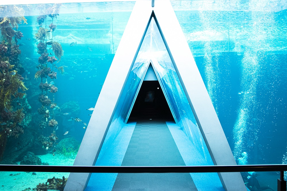 三角トンネルが潮目を表す大水槽「潮目の水槽」で海の中をお散歩