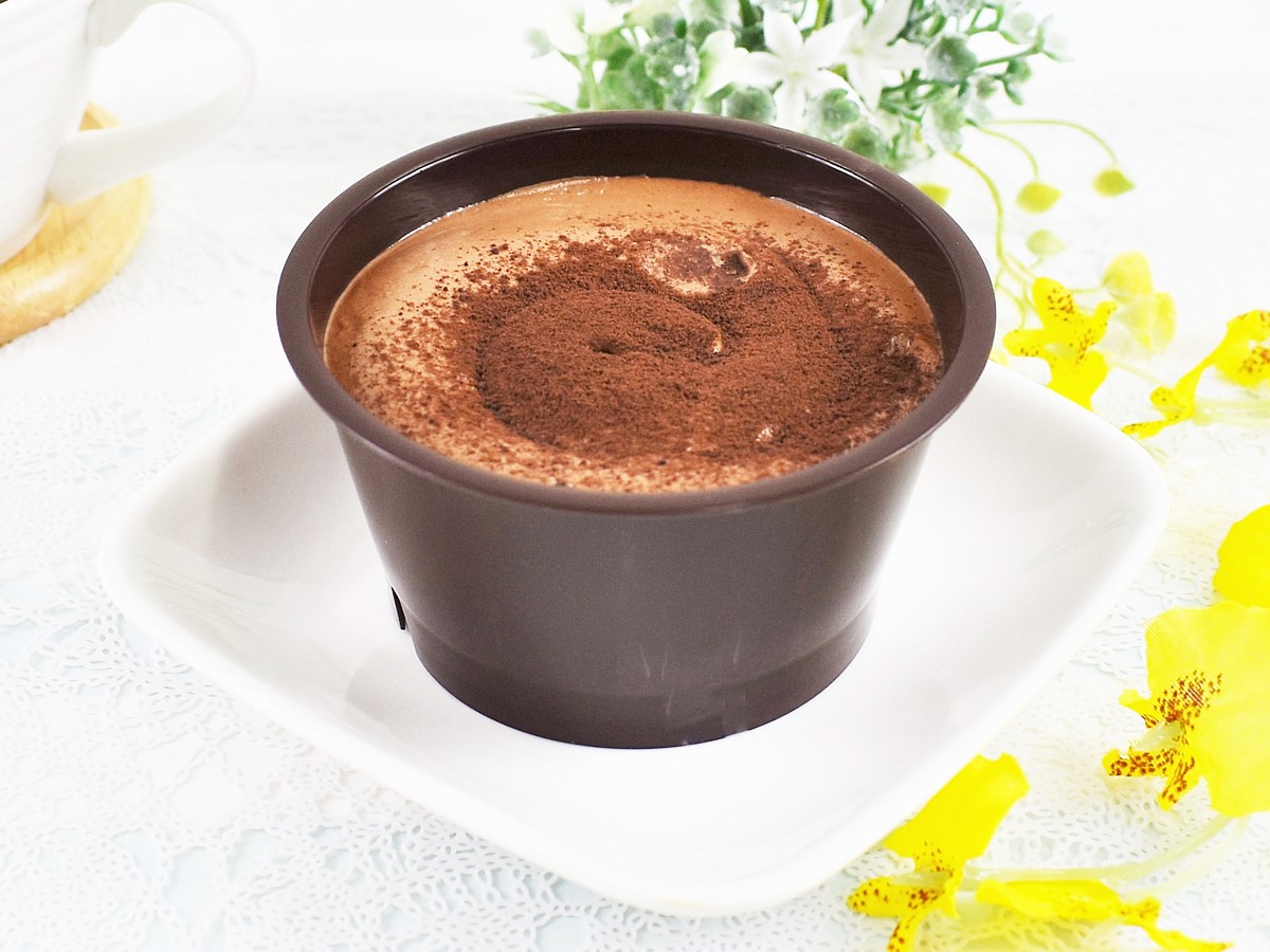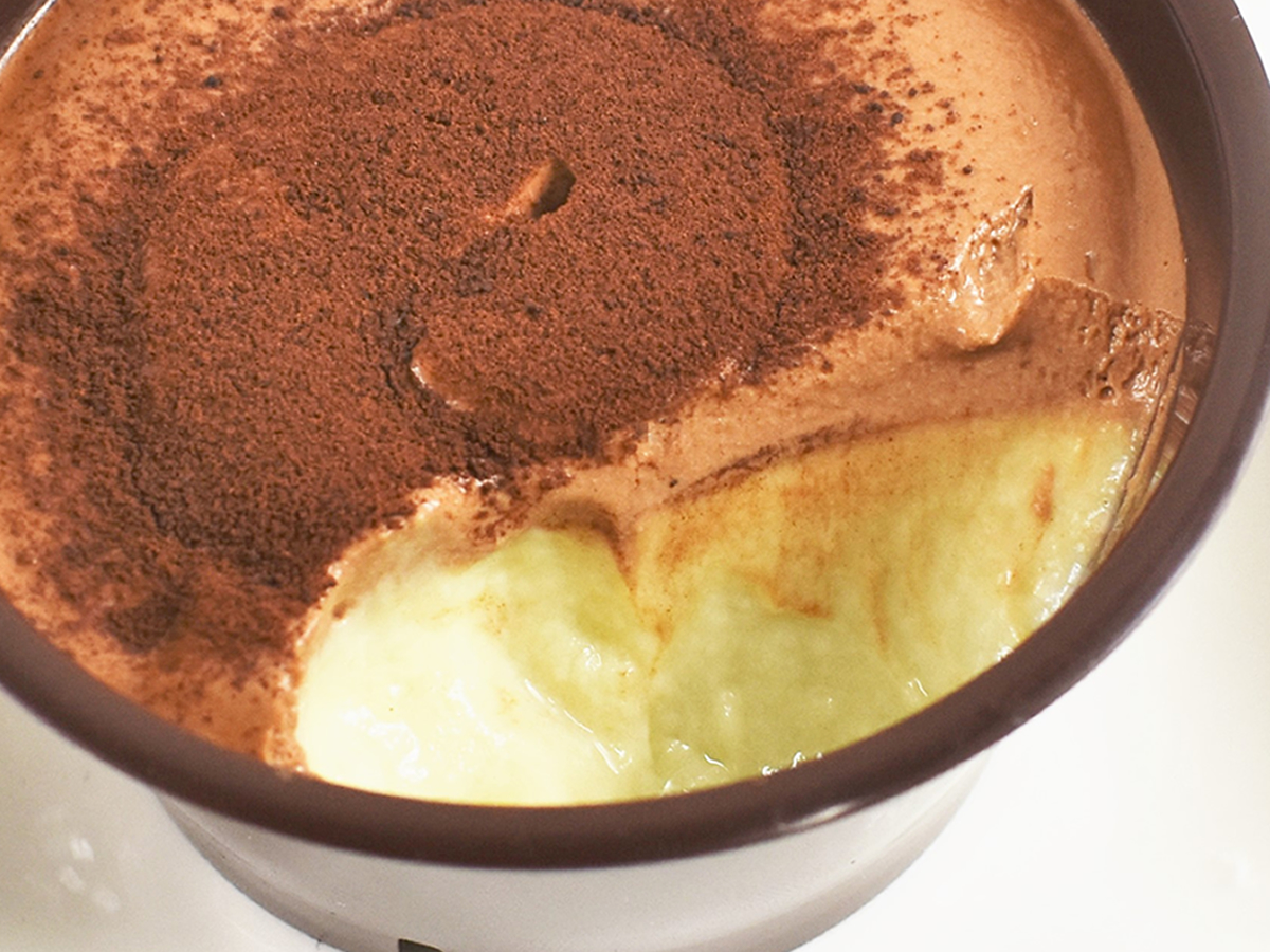 まず注目したのはパッケージ。バナナのイラストが可愛く描かれ、チョコとバナナが混じったようなキュートなシールが特徴的です。フタを開けると、ココアパウダーがふんだんにかけられたプリンがお目見え。バナナプリンとチョコムースの上には、ココアパウダーがたっぷり振りかけられており、ちょっとした高級感が感じられます。