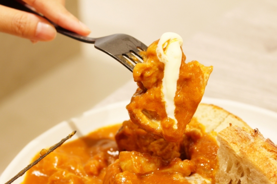 マルシャンドゥブールという粗挽きライ麦を配合した酸味のあるパンに、辛さ控えめのまろやかなバターチキンカレーをかけ、クロテッドクリームをあしらった、同店特製の“包まれていないカレーパン”。