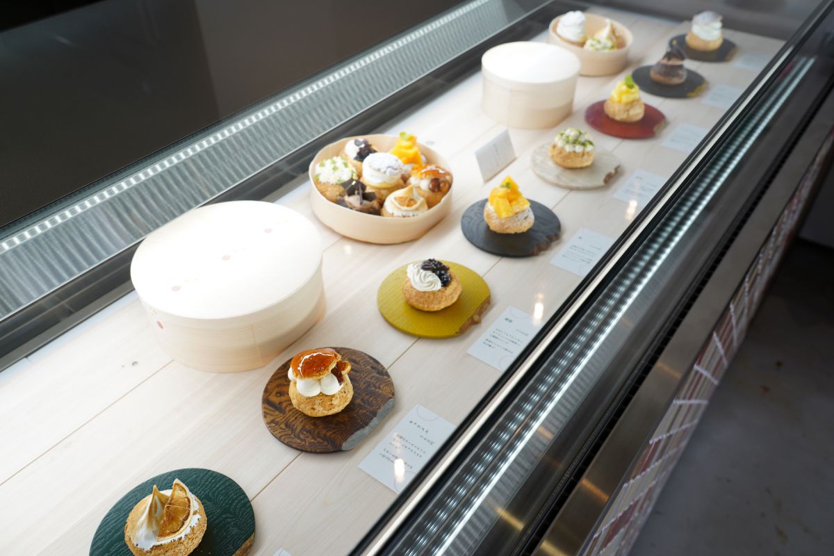 そしてこのショーケースのステージに立てるシュークリームは常時8種類のみ。神7ならぬ”amagami8”。京北町の「吉田木工」が造形し、「京桐工芸漆工房」が漆を塗って仕上げた皿に置かれたシューは、1つずつの存在感はもとより、ショーケースに8つ並んだときのバランスを計算しながらデザインされているそう。