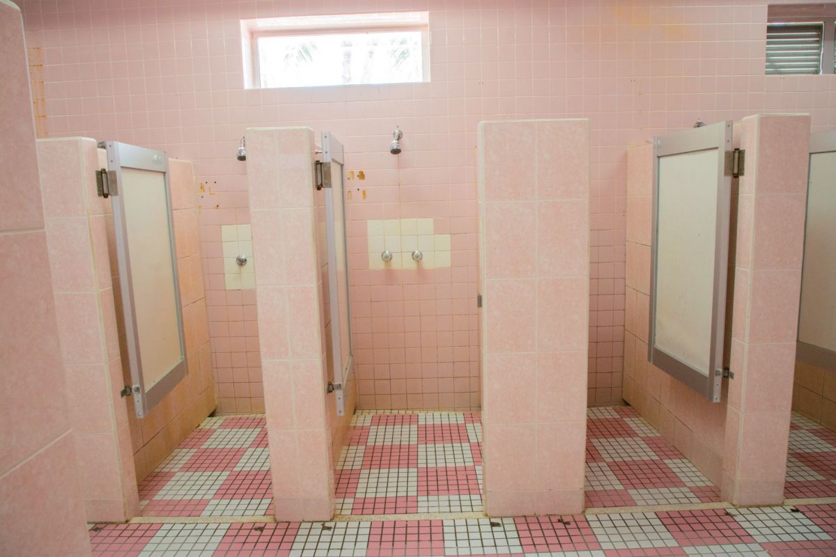 建物を移動すると、温水シャワーとトイレ、清潔な更衣室が。女性用にパウダールームも完備しています。