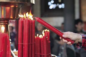 境内でお線香を受け取ります。ロウソクは2本NT$5~で、販売所で購入します。