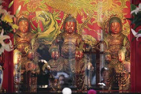 お線香を頭上に掲げ、名前・生年月日・住所を告げます。三川殿に並ぶ三体の像に3回拝礼をします。