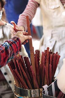 心の中で願いを唱えながら、「筊」を2つ投げます。表裏がでればOK。3回まで挑戦できます。