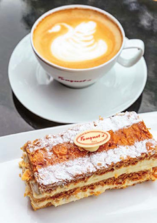 創業当時から続くレシピで作るミルフィーユ(€14)とカフェ・オレ(€1)。2017年に改修工事を終えたばかりの赤を基調としたテラス席で伝統のメニューをどうぞ。