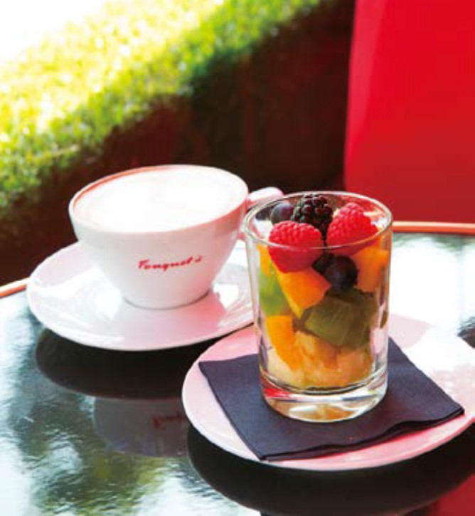 朝食にもおすすめのフレッシュフルーツのサラダ(€8)は見た目もかわいい!もちろんフード以外にもみどころはたくさんです。入口には映画監督のリュック・ベッソンほか、訪れた映画スターなどのネームプレートがあるので、映画ファンは必見です!