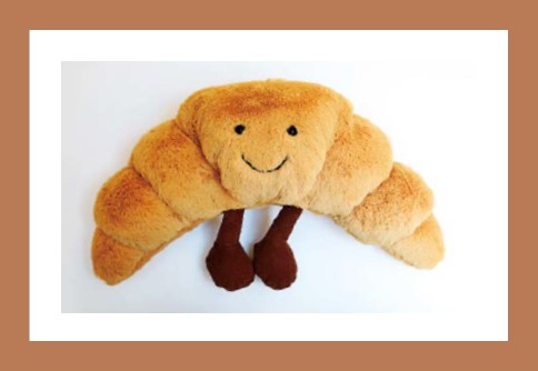 クロワッサンのキャラクターがキュートなぬいぐるみ(€30)は小さなお子さんへのおみやげにはもちろん、女子ウケもばつぐんなかわいいアイテムです。