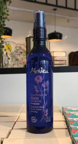 『メルヴィー』のダマスクローズの化粧水(€8.90)はブルーのかわいいボトルが目印!お部屋に置いてもかわいくて一石二鳥です。