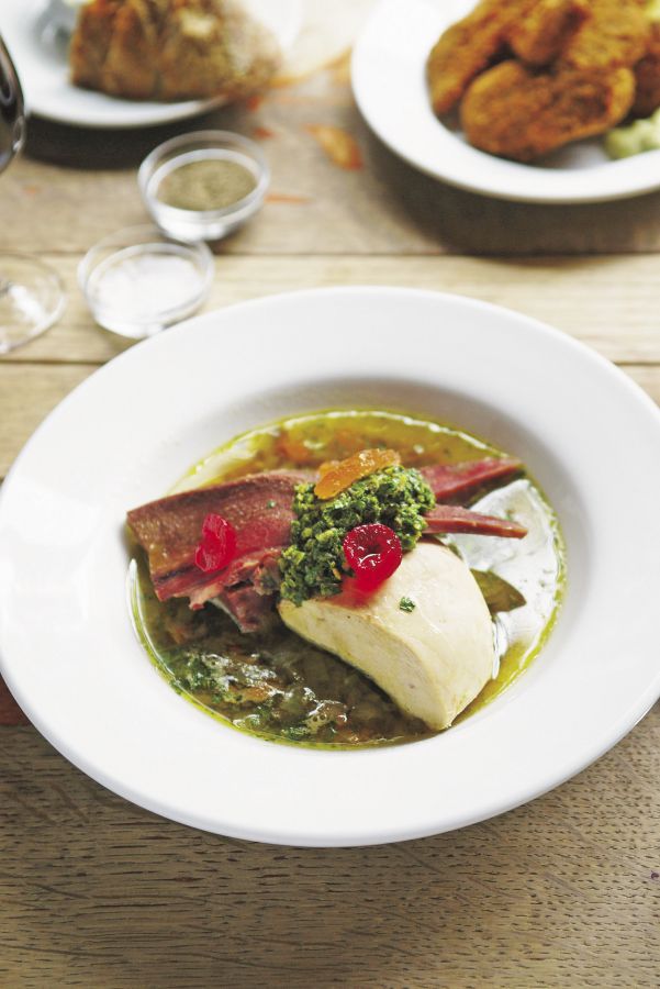 スウェイルデール肉のポーチ(£16.80~)は、ゆでたお肉をレンズ豆のグリーンソース、マスタード、フルーツと合わせていただきます。