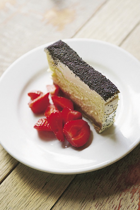 バニラとケシの実の風味のチーズケーキに、イチゴが添えられたベイクドチーズケーキは£6.80。