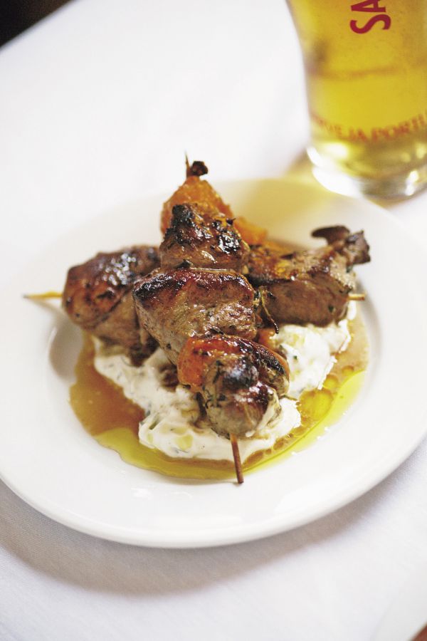 こんがり焼いたラムと、アプリコットをギリシア風ザジキソースでいただく「ラムとアプリコットの串ざし」£9.50はビールと相性抜群!