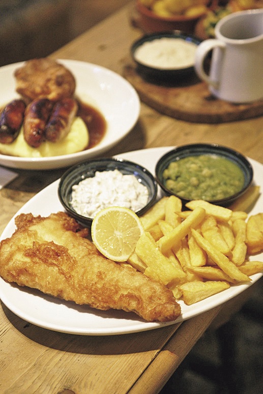 ビール入りの衣で揚げたフィッシュとチップス「コッド&チップス」もおすすめ。マッシー・ピース添えです。£14.50。