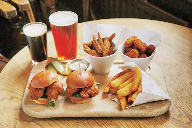 ウエストミンスターの官庁街にある伝統的なパブ、レッド・ライオン。モルトの香ばしさとコクのあるロンドン・プライドやフルーティな味わいのフロンティアなどのビールを、ビーフバーガーやチキンと味わうのがおすすめです。