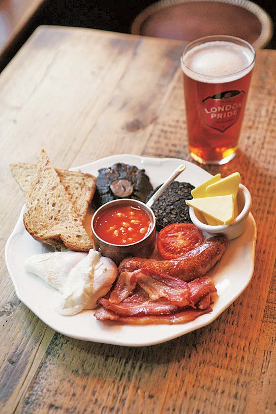 こちらは1パイント£4.85人気のビール、ロンドン・プライドと、ボリュームたっぷりのイングリッシュ・ブレックファスト。ちょこちょこつまみながらビールを飲み、まったりと過ごす時間が最高にしあわせ…!