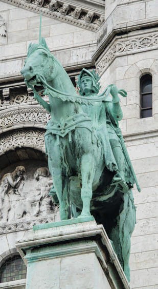 入口にもみどころがあるのでお見逃しなく!両脇の騎馬像は向かって左がルイ9世像、右はジャンヌ・ダルク像です。(写真はジャンヌ・ダルク象)