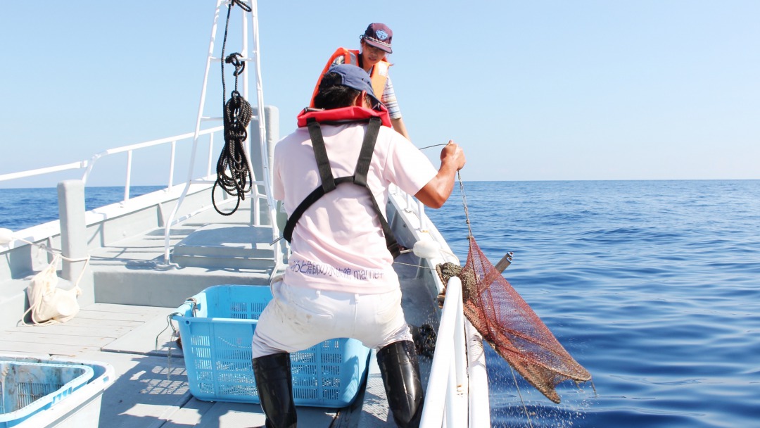 ここの嬉しいポイントは、季節にあわせて、カニ、エビ、魚などの漁が体験できること! これからは、イセエビが始まります! 大漁日にはクール便で友達や親戚に送ることができますよ。