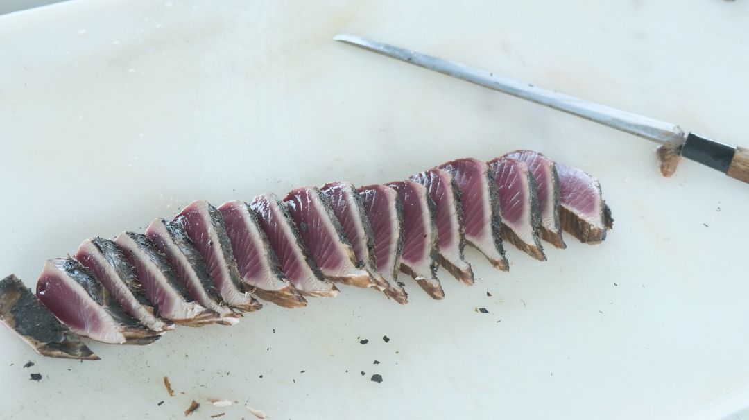 見てー♪この透き通るカツオの身、そして炙り加減!漁師さんの指導により、豪快に炙って、できました!涙が出るほど美味しいです。
