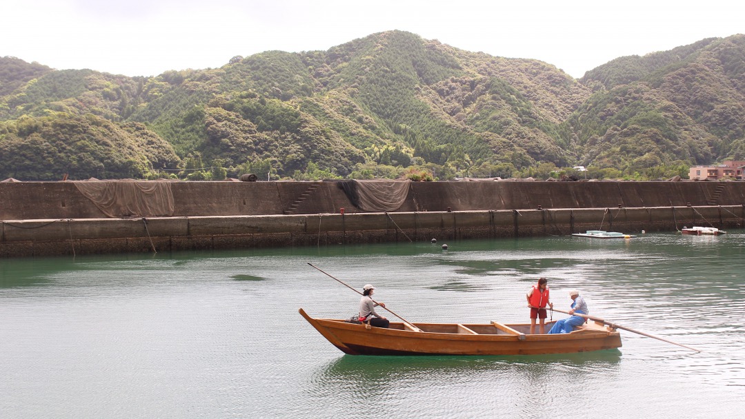 陸からすぐ目の前で体験できるので、船酔いの心配はなし。ベテラン漁師さんの指導のもと、湾内を昔ながらの木造船をギーコギーコと人力で動かしました。木製の船はかっこいいけど、昔の人はこれに乗って漁にでていたってすごいです。