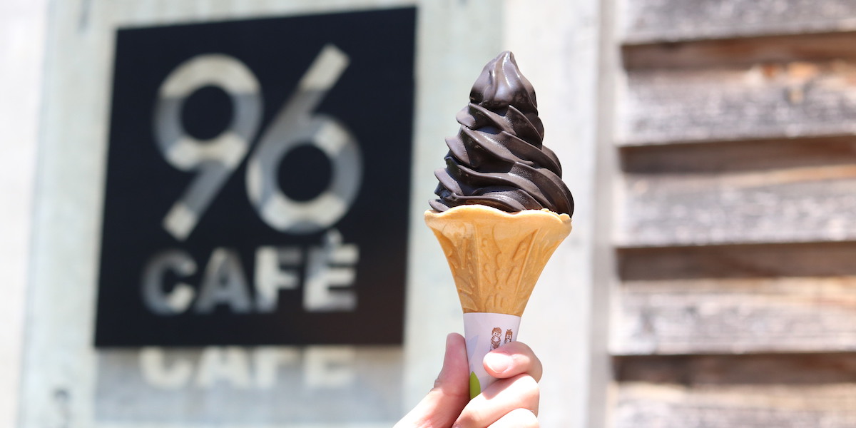 滋賀県・長浜市にある「黒壁スクエア」は、江戸末期から昭和初期の風情が今も残るレトロタウン。通り沿いにはすてきなショップやガラス工房、歴史ある和菓子店やご当地グルメが連なり、お散歩を楽しく盛り上げてくれます。そこでのおやつに「96 CAFÉ」の黒壁ソフトをテイクアウトするのが定番です!
