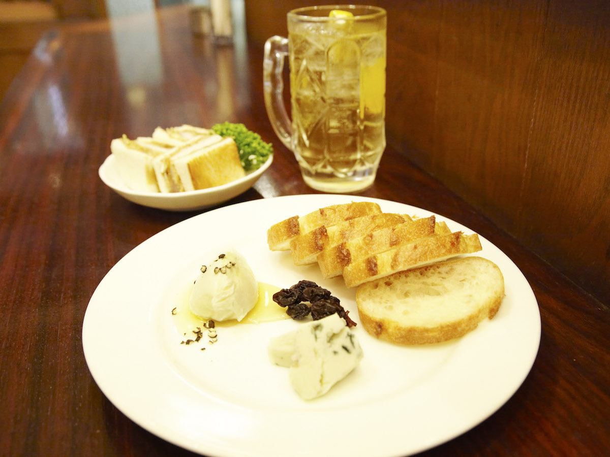 ゴルゴンゾーラとマスカルポーネチーズ、干しレーズンとバゲットが乗った、チーズの盛り合わせ(500円)は、見た目も美しいお店の人気メニュー。