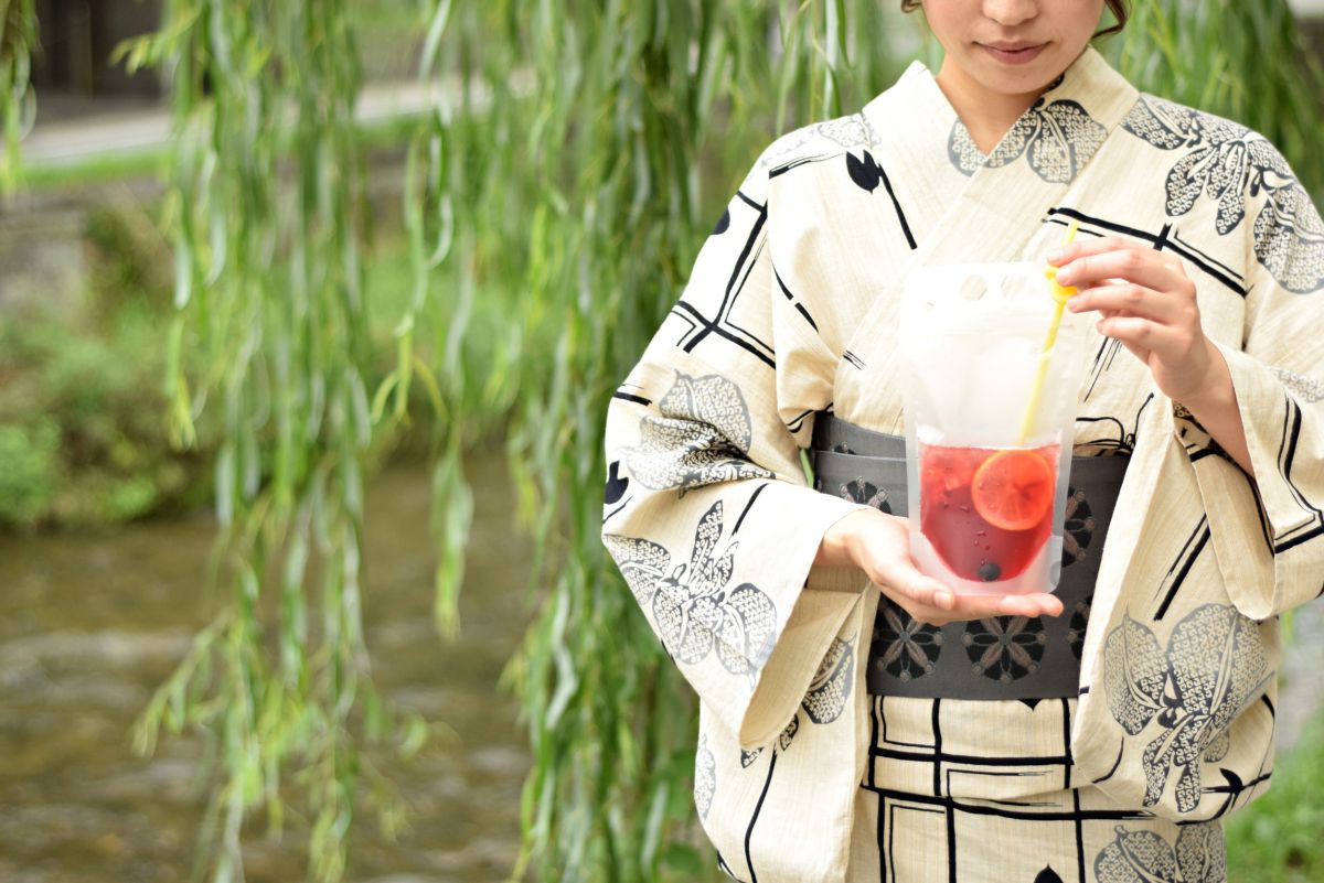 京都市内は、さまざまな景観政策で守られた昔ながらの街並みがいたるところに残っています。着物でさんぽすると、絵になりますよね。そんな昔ながらの風景と着物姿に、屋台で釣ったヨーヨーのようにカラフルでノスタルジックな「カチワリソーダ」はよく似合います。