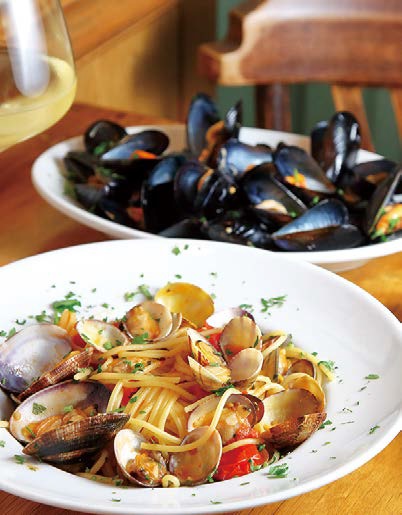 「スパゲッティ・アッレ・ヴォンゴレ」は、殻付きのアサリをたっぷり使った定番スパゲッティ(€14)。奥はムール貝を蒸し焼きにしたズッパ・ディ・コッツェ。