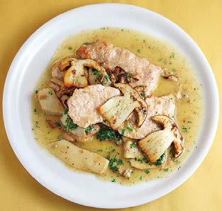 「スカロッピーネ・アイ・フンギ・ポルチーニ」は、薄くスライスした仔牛肉に軽く小麦粉をまぶしてソテーしたもの。ポルチーニもたっぷり味わうことができますよ。€18。