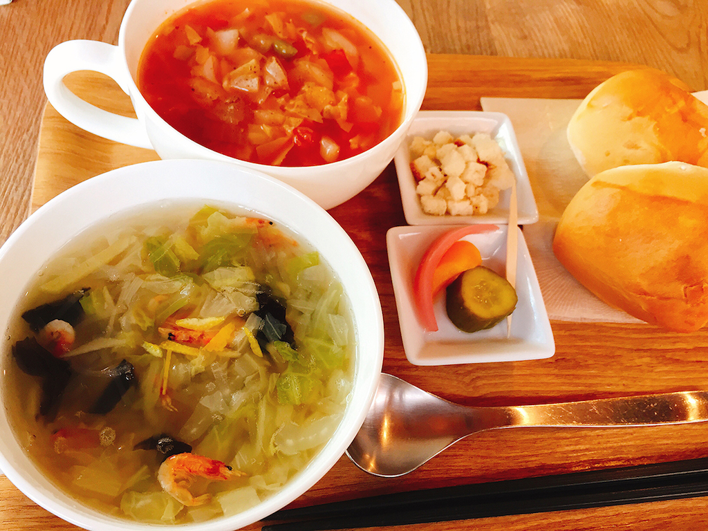 プチパン(2個)か黒米ご飯がつき、スープが1種類のセットはワンコインの500円という安さ。2種類つく「まんぷくスープセット」も750円でいただけます。