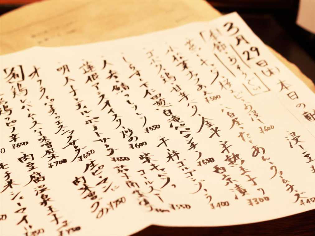 温かみのある店内にふさわしく、メニューは手書き。定番料理に「マルサラ飲食店」ならではの“ひとヒネリ”を加えた、お酒に合いそうな創作メニューばかり。ハルノさんいわく、産地やブランドよりも鮮度や旬のおいしさを優先し、自分たちがおいしいと感じる調理の提供を心がけているそう。