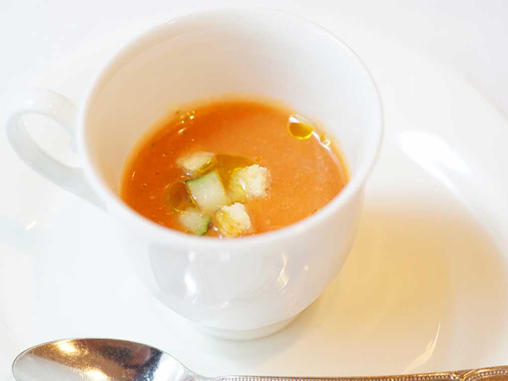 デミタスカップに入ったガスパチョは、トマト、ピーマン、セロリ、パプリカなど、数種類の野菜を使ったスープ。ベースとなるトマトは、静岡大学の農業研究施設で温室栽培されたもの。素材の質にもとことんこだわっています。