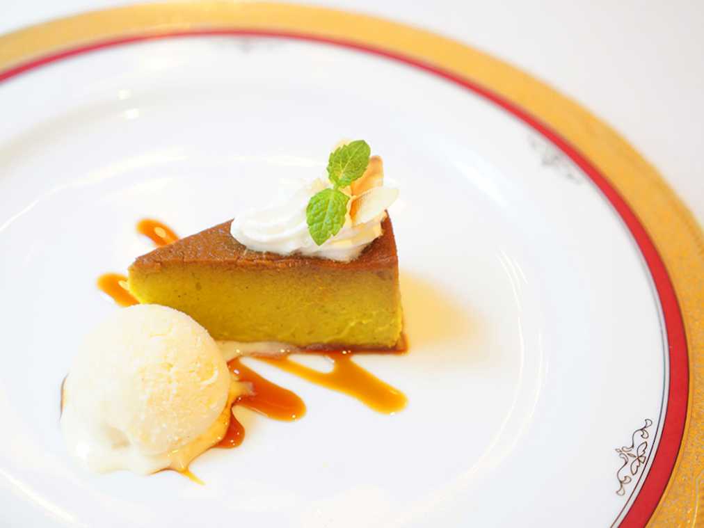 コースを締めくくるデザート、この日は鹿児島県産のかぼちゃ「栗五郎」を使ったプリンです。皮も一緒に裏ごしして、かぼちゃをまるごといただきます。皮には抗酸化作用のある「ファイトケミカル」がたっぷりと含まれているそう。自家製のバニラアイスがかぼちゃの風味を引き立てています。