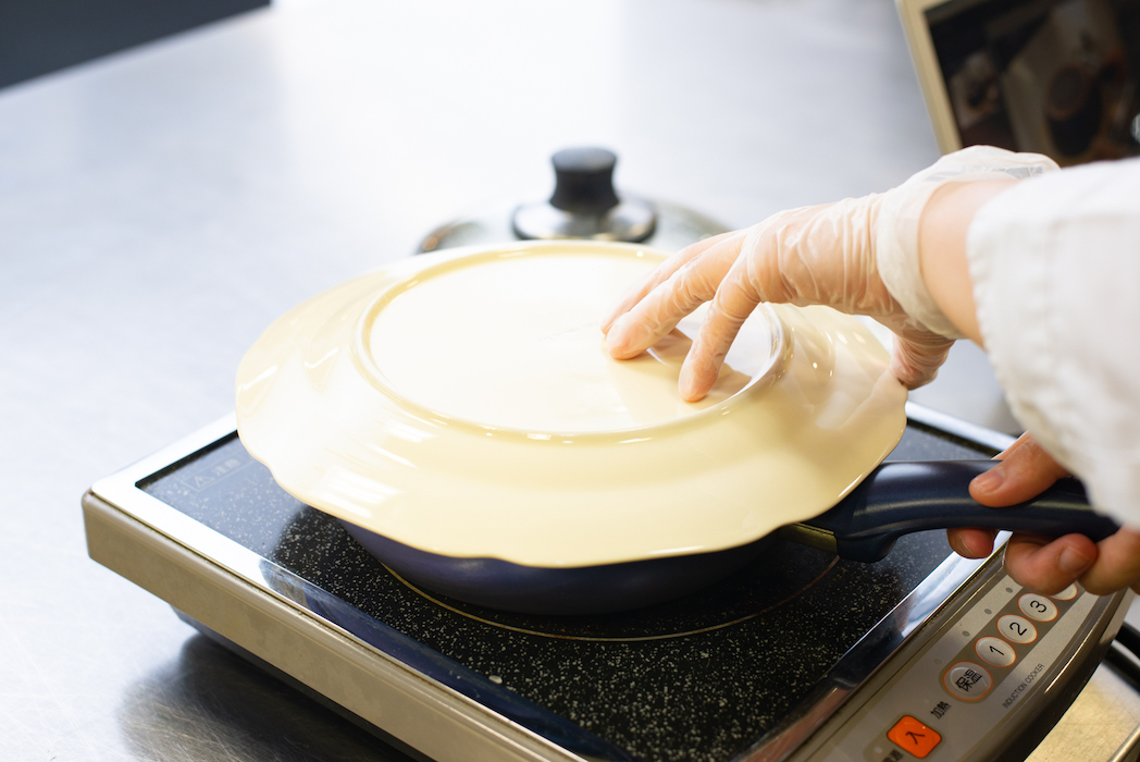 次に皿ごとオムレツをフライパンにかぶせれば…