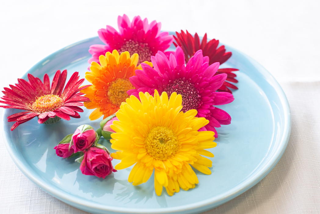 差し色は、情熱のビビットカラー!ハッとするほど発色の美しいガーベラの花は、上品さもプラスしてくれます。