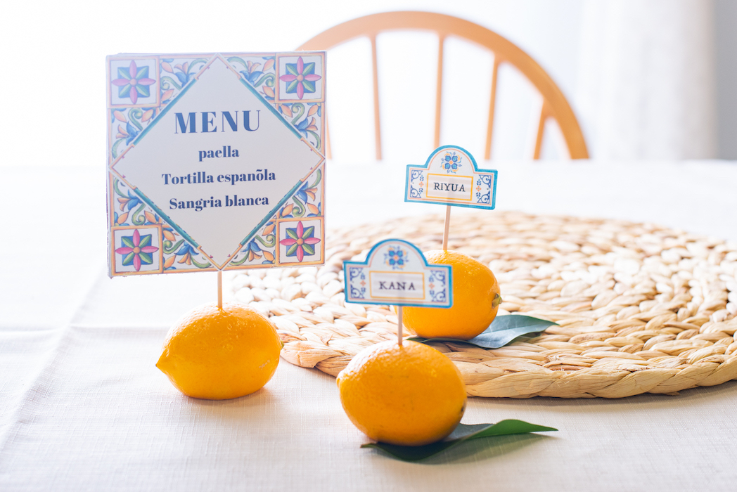 パーティー感を盛り上げるネームピック。今回はサングリアの具材としても登場したレモンの上に刺してみました。レモンの底をナイフでカットしておくと、置いたときに転がりません。ネームピックはスペインの家の表札を画像検索し、プリントしたものなんですよ。