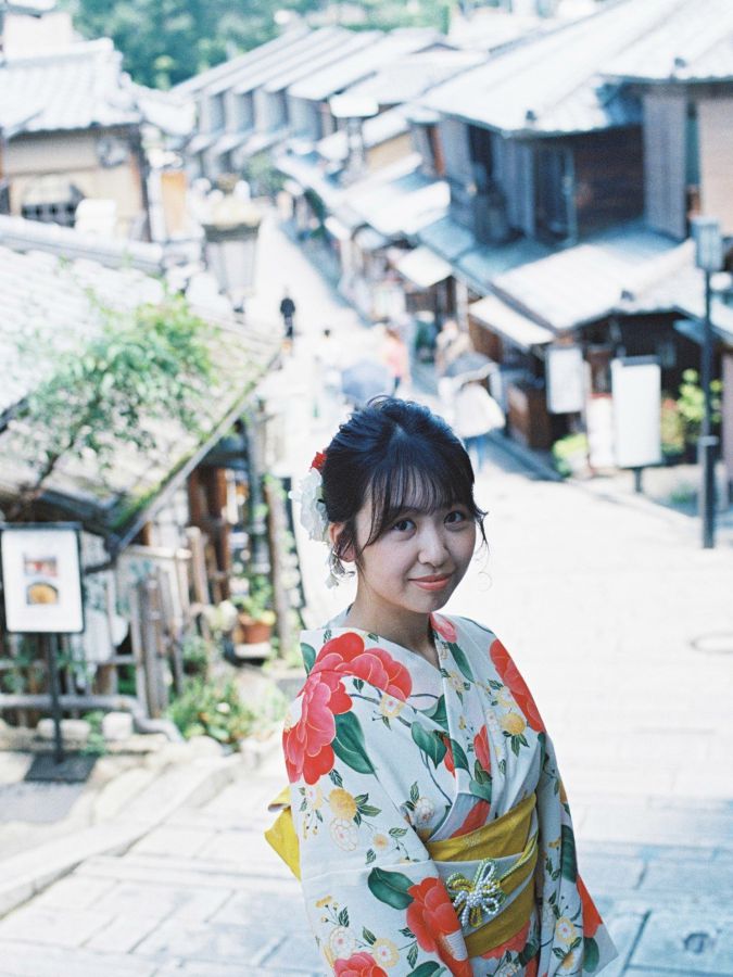 今回は、「レンタルきもの岡本 清水東山店」さんで着物をレンタルしました。「レンタルきもの岡本」さんは、京都の観光地の真ん中に6店舗もお店を構えているので、どの店舗でレンタルしても、アクセスばっちりなのが魅力的。今回お借りした「清水東山店」さんも、「八坂の塔」から5分ほどの場所にあるので、スタートするには好立地なのです。