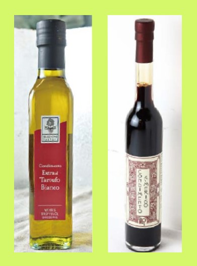 写真左のエクストラバージンオリーブオイル(€30.98)は、白トリュフのエキスが入った高品質のもの。右のバルサミコ酢(€8.90)は、ボローニャのミシュラン星付きレストラン「ダ・アメリーゴ」のオリジナルです。