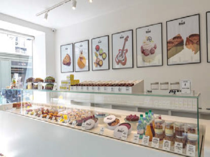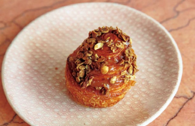 ラデュレのトップパティシエを経て、2016年にオープンしたニコラ・アレウィンのパティスリー。写真のキャラロール(€3.50)は、キャラメル入りヴィエノワズリーにキャラメルソースとナッツ、シリアルがのっていて、食感も楽しい一品です。