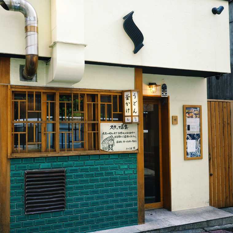 新宿駅から代々木駅方面へ10分ほどのところにある「慎(しん)」は、シックなブルーグリーンのタイルにモダンな印象を受けるロゴが目印のうどん屋さんです。